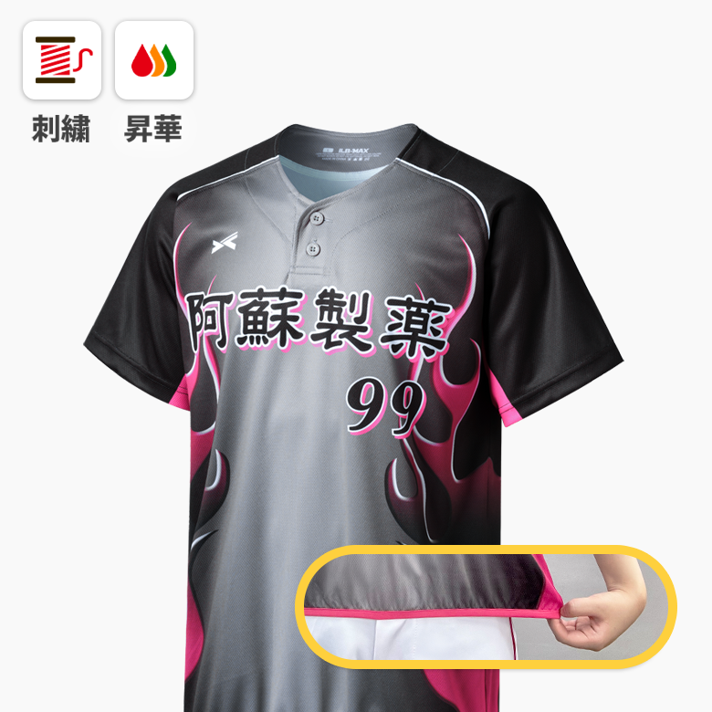 - 昇華制作は、お好みのデザインをインクで転写用紙にプリントした後、高熱と圧力を加えて生地に染み込ませる方法です。 昇華ユニフォームは鮮やかで多様なデザインを具現できます。 昇華は通常、ユニフォームの全体的な柄や色を入れるときに使用されます。 昇華のメリットは、コストが安くデザインの自由度が高く、生地の品質が長持ちすることです。 昇華のデメリットは、生地の選択が制限されることです(スタンダードメッシュ/マイクロメッシュ)