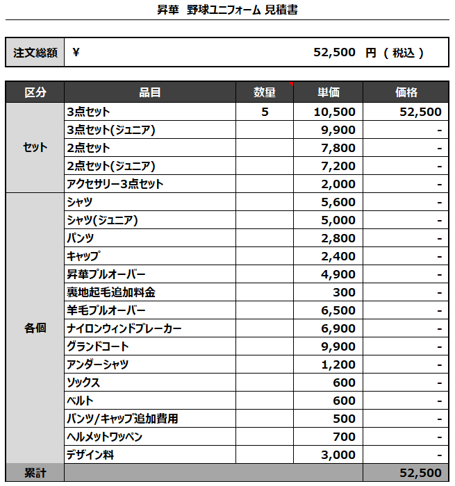 注文するユニフォームの最終デザインと見積もりの数量を確認ください。