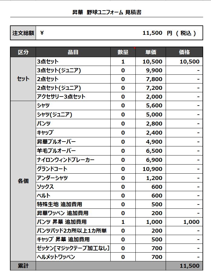 注文するユニフォームの最終デザインと見積もりの数量を確認ください。