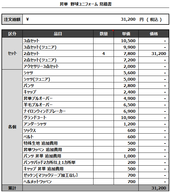 注文するユニフォームの最終デザインと見積もりの数量を確認ください。