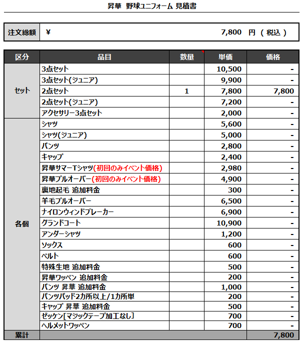 注文するユニフォームの最終デザインと見積もりの数量を確認ください。