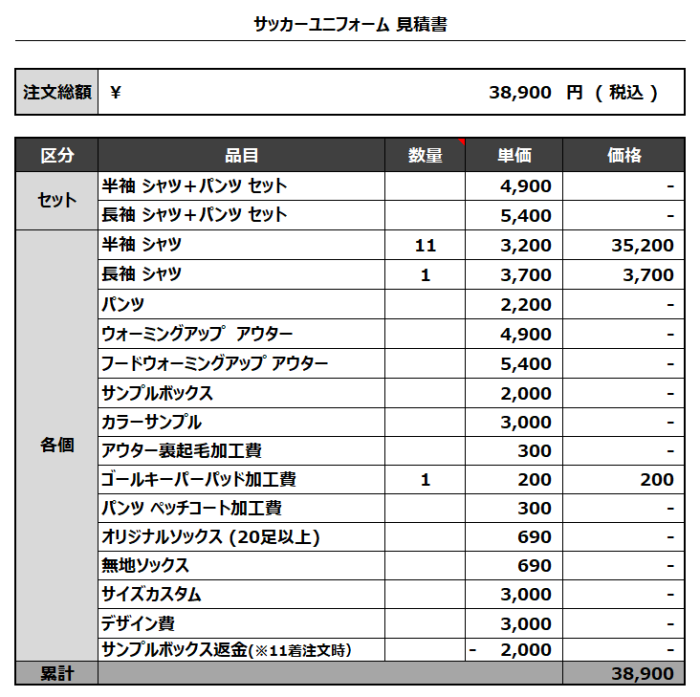 注文するユニフォームの最終デザインと見積もりの数量を確認ください。