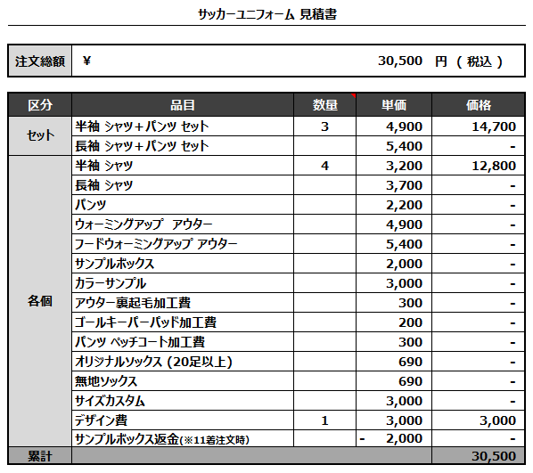 注文するユニフォームの最終デザインと見積もりの数量を確認ください。