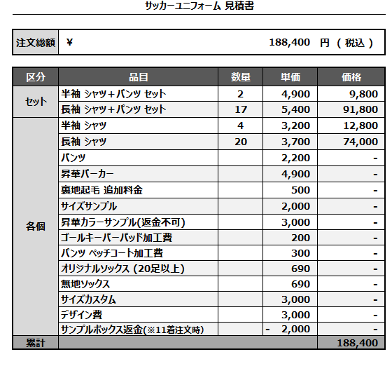 注文するユニフォームの最終デザインと見積もりの数量を確認ください。