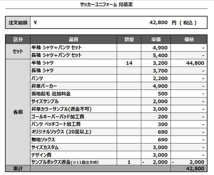 注文するユニフォームの最終デザインと見積もりの数量を確認ください。