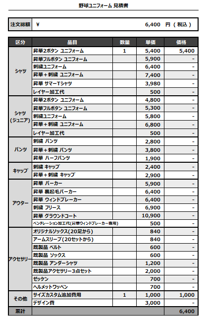 注文するユニフォームの最終デザインと見積もりの数量を確認ください。