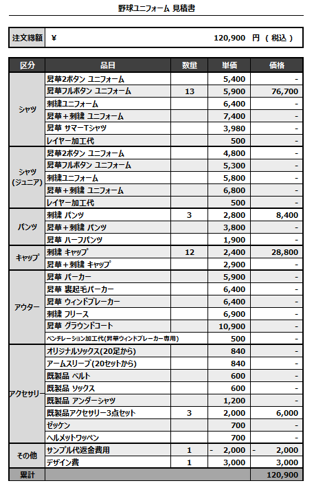 注文するユニフォームの最終デザインと見積もりの数量を確認ください。