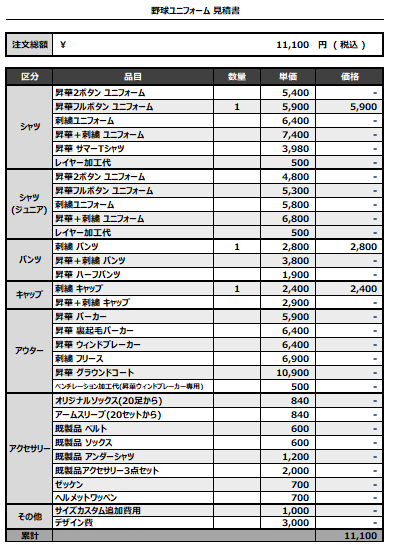 注文するユニフォームの最終デザインと見積もりの数量を確認ください。