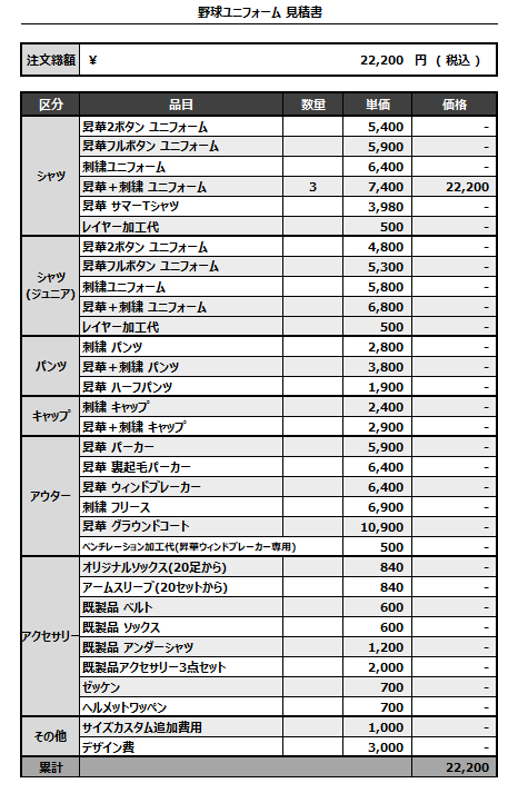 注文するユニフォームの最終デザインと見積もりの数量を確認ください。