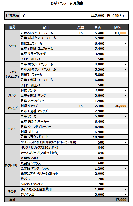 注文するユニフォームの最終デザインと見積もりの数量を確認ください。