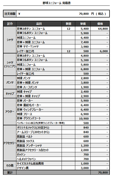 注文するユニフォームの最終デザインと見積もりの数量を確認ください。
