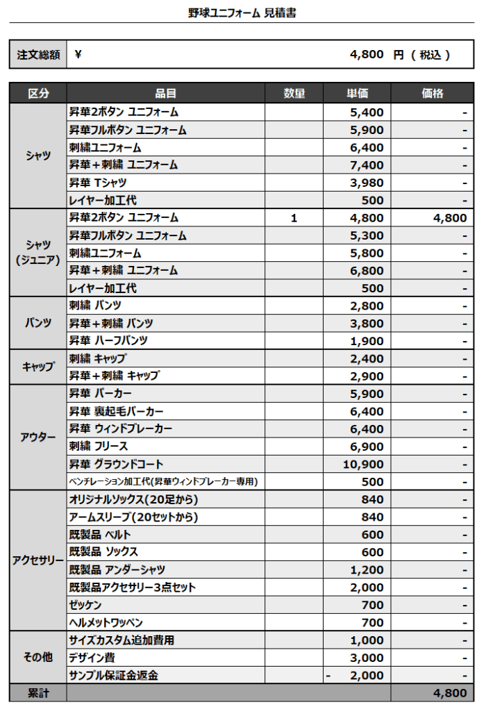 注文するユニフォームの最終デザインと見積もりの数量を確認ください。