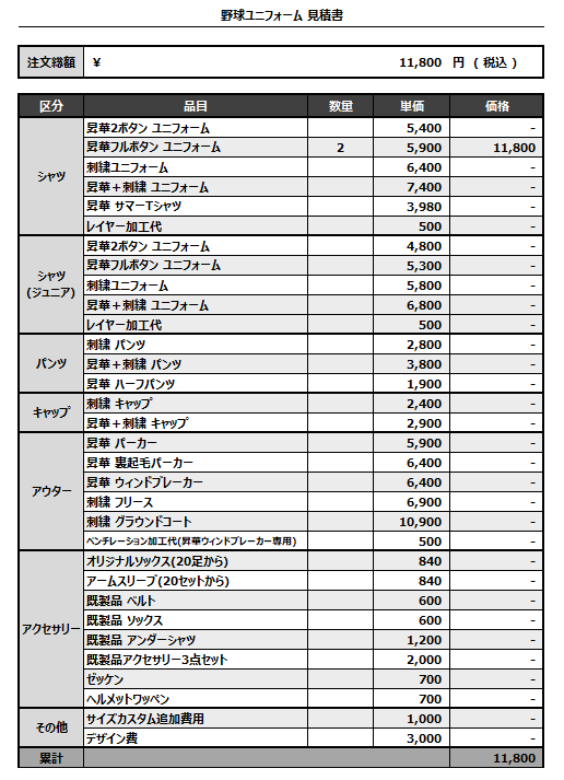 注文するユニフォームの最終デザインと見積もりの数量を確認ください。
