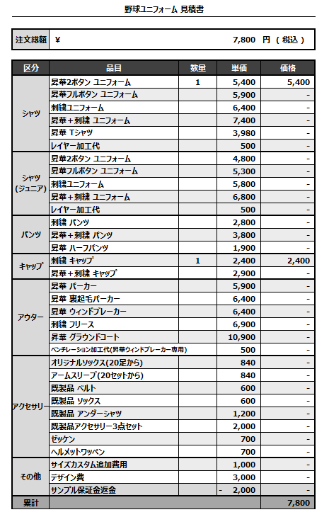 注文するユニフォームの最終デザインと見積もりの数量を確認ください。
