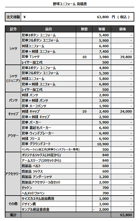 注文するユニフォームの最終デザインと見積もりの数量を確認ください。
