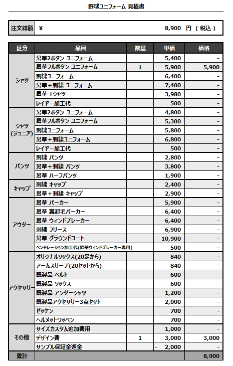 注文するユニフォームの最終デザインと見積もりの数量を確認ください。