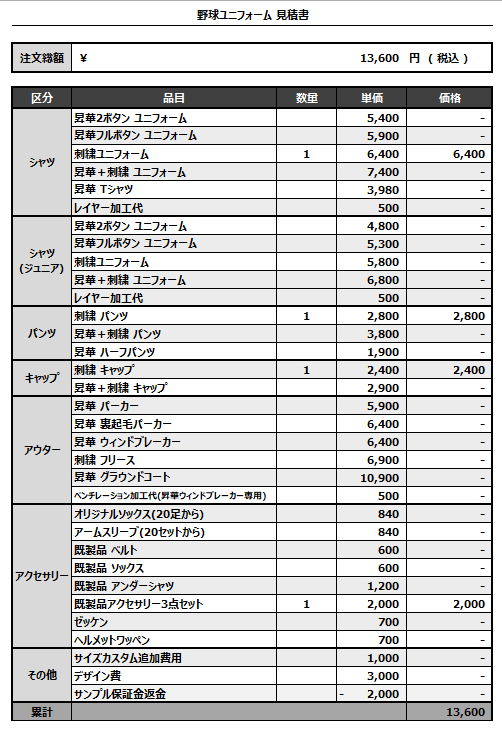注文するユニフォームの最終デザインと見積もりの数量を確認ください。