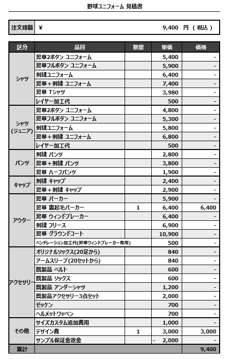注文するユニフォームの最終デザインと見積もりの数量を確認ください。