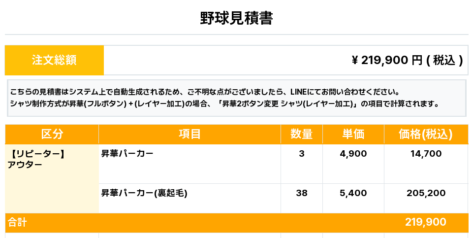 注文するユニフォームの最終デザインと見積もりの数量を確認ください。