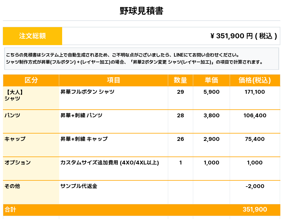 注文するユニフォームの最終デザインと見積もりの数量を確認ください。