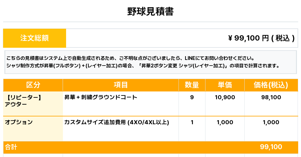 注文するユニフォームの最終デザインと見積もりの数量を確認ください。